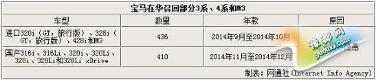 根据质检总局公布的消息,此次召回计划将由宝马中国和华晨宝马共同实施。其中宝马中国涉及召回车型为进口320i(GT,旅行版)、328i(GT,旅行版)、428i和M3,生产日期区间2014年9月至2014年10月,共计436辆。而华晨宝马召回车型为316i、316Li、320i、320Li、328i、328Li和328Li xDrive,共计410辆,生产日期2014年11月至2014年12月 。