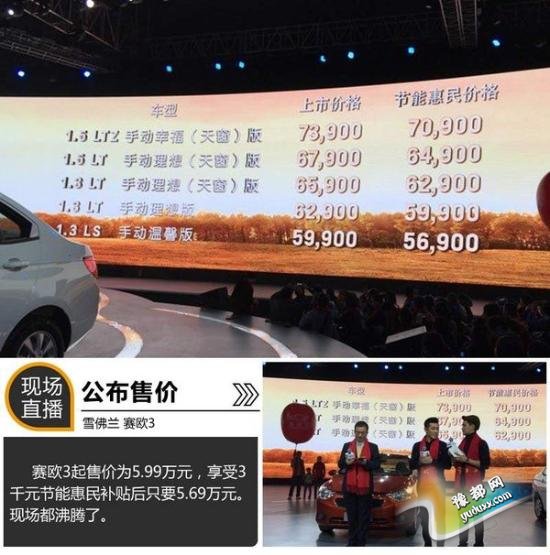 十五年前,雪佛兰旗下A0级轿车第一代赛欧打着“10万元家轿“的旗号进军中国市场。截至目前赛欧已经在华累计销售近140万辆,如今月均销量仍保持在2万辆左右。在今年广州国际车展上,雪佛兰携第三代赛欧——赛欧3亮相引来众多关注。今天,赛欧3在成都正式上市。新车搭载1.5L和1.3L两款发动机,共推出5款车型,售价区间为5.99万-7.39万元。而全系车型在享受节能惠民补贴后,价格只需5.69万-7.09万元。