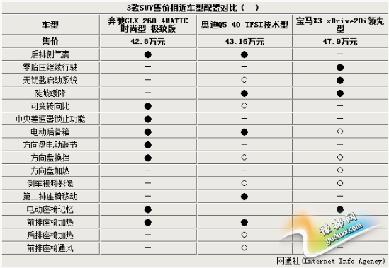 这三款豪华SUV车型都配备了包括前后气囊、胎压监测等安全性配置,全景天窗、中控彩色大屏、电动座椅调节等舒适性配置,以及启停技术、车载互联娱乐系统等先进的科技配置。除此之外,由三款对比车型可以明显看出,奔驰GLK拥有方向盘电动调节、转向头灯、自动泊车、防炫目后视镜等等,而这些在X3、Q5上并没有装备。另外,得益于产品的国产化,产品价格更低,综合考虑下GLK相比其他两款产品更具有优势。(网通社 2014年12月17日 北京报道)