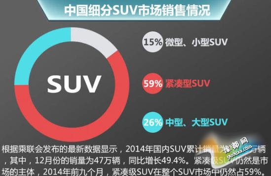 根据乘联会发布的最新数据显示,2014年国内SUV累计销量为381.9万辆,其中,12月份的销量为47万辆,同比增长49.4%。紧凑级SUV仍然是市场的主体,2014年前九个月,紧凑级SUV在整个SUV市场中仍然占59%。讴歌RDX是一款紧凑级SUV车型,凭借个性的外观、出众的动力与性能、宽敞的内部空间和卓越的安全性,RDX被消费者喻为“恰到好处”的SUV,备受年轻豪华车消费者的关注。