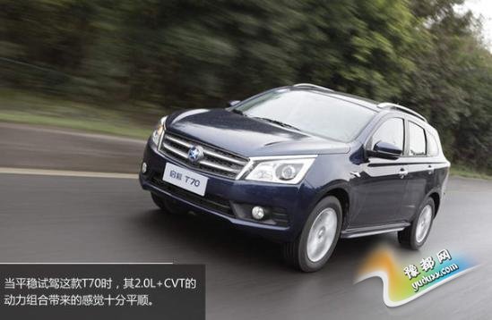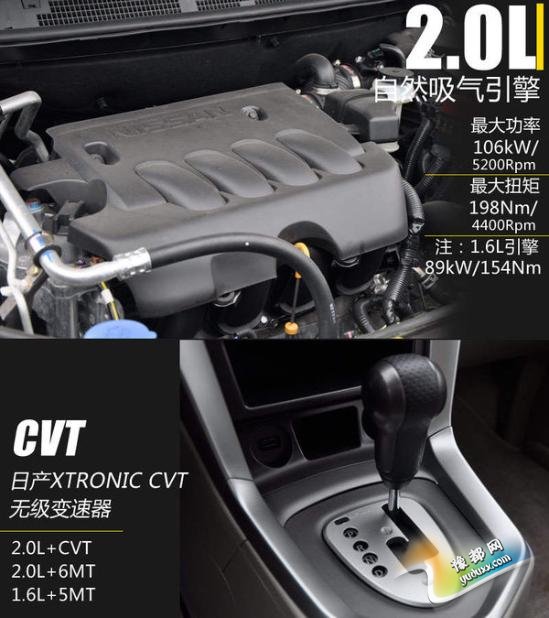启辰T70搭载与逍客相同的1.6L和2.0L两种排量发动机,其中2.0L发动机最大功率106千瓦,峰值扭矩198牛米。此次试驾车型为2.0L+CVT的动力组合,此外2.0L车型还将搭配6MT变速箱,1.6L车型则仅有5MT的变速器搭配。CVT与2.0L的动力组合来看,T70更加偏向于城市家用舒适型。