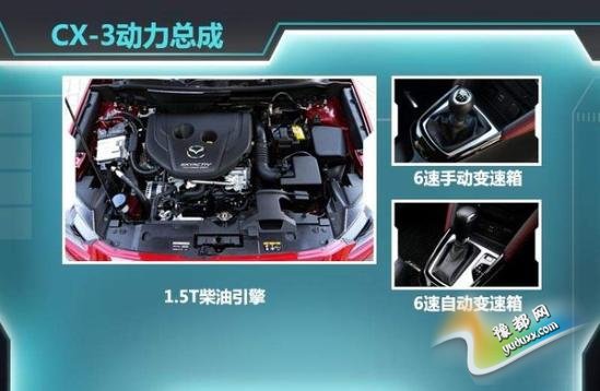 马自达在日本本土所出售的CX-3分为全时四驱和前驱版本,采用马自达设计的扭矩控制式四轮驱动系统,其中搭载具备创驰蓝天技术的1.5升柴油涡轮引擎,在六速自动变速箱或六速手动变速箱配合下可以将油耗分别控制在21.0公里/升,23.0公里/升和25.0公里/升以内。由于新车还采用清洁柴油发动机,可使其活塞内部震动噪音大幅降低。