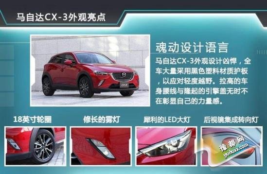 CX-3在外形设计方面延续了马自达家族式设计语言,魂动设计动感而时尚。叶子板边缘则采用黑色塑胶材质的轮眉,使得这样一款主打城市性能的SUV又增添了几分硬汉性格。新车有望搭载18英寸双色轮圈,在低扁平率轮胎的搭配下,无论操控感还是美观度都会十分具有竞争力, 个性十足的雾灯与LED大灯遥相呼应,而集成转向灯的后视镜则符合时下设计潮流。CX-3的长宽高分别为4275/1765/1550mm,2570mm的轴距足以保证车内的空间。