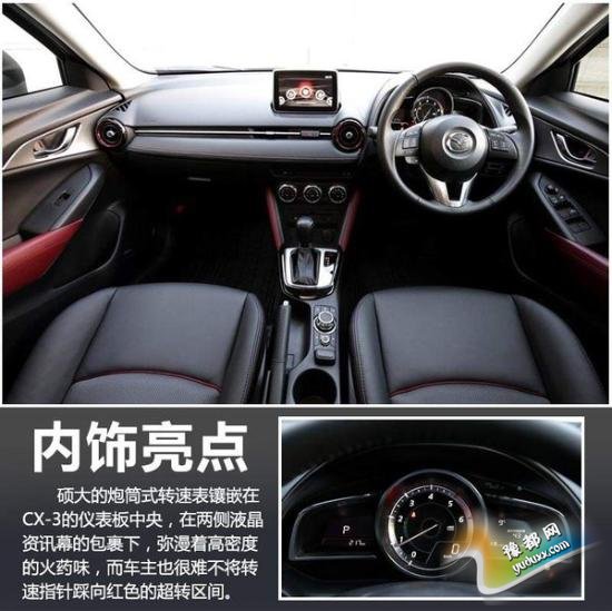 较高的科技含量也是CX-3的一大卖点。新车将搭载新一代接口的HMI、抬头可视系统和定速巡航等。主动安全系统还包括红外线探测,自动刹车,车道偏移预警,以及车侧盲点辅助功能等。(网通社 2015年1月27日 北京报道)