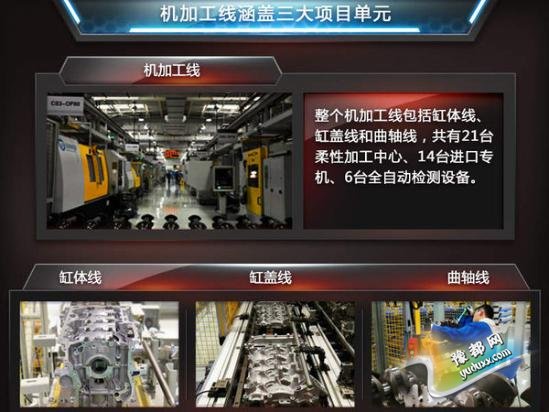 机加工线有3条自动化、精益化、柔性化的现代化生产线,产能10万台/年,每小时产能14.8台,每天可制造330台。整个机加工线包括缸体线、缸盖线和曲轴线,共有21台柔性加工中心、14台进口专机、6台全自动检测设备。加工尺寸普遍在mm级以下,其中高精度的μm级约占其中的2‰。高精度加工工位均配备进口红宝石测量测头,对加工过程进行实时监控,确保可靠的高精度加工结果。