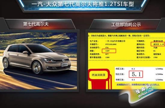 【大河汽车·厂家动态】此前大众品牌旗下首款采用MQB平台打造的第七代高尔夫正式在华投产上市,先期推出了1.6L和1.4TSI两种排量共消费者选择。近日大河汽车从工信部了解到,一汽-大众将推出搭载1.2TSI小排量增压发动机的车型,相比目前1.6L车型而言,在燃油经济性上得到了大幅提升,百公里油耗下降16%。