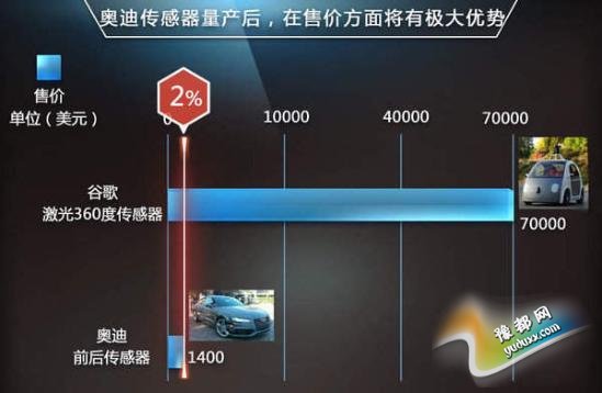 IT行业的优势在于软件和互联网,汽车界的优势在于机电一体化,和应对复杂环境的韧性。比如谷歌的激光360度传感器安在车顶,对于风阻和安全性都有不利影响,而且价格高达7万美元。而奥迪的激光传感器,分别按在车前车后,各自担任140度的扫描车。因为马上可以量产,价格只有谷歌的2%。