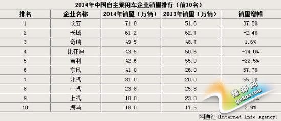《盘点2014十大自主乘用车销量 最高增5成》由河南新闻网-豫都网提供,转载请注明出处:http://auto.yuduxx.com/changjia/138797.html,谢谢合作!
