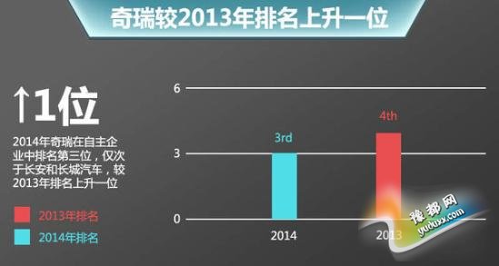 值得一提的是,作为民营企业的奇瑞,通过及时的战略调整和可靠的产品品质,在这场长达12月之久的“寒冬”中存活了下来,并在销量上保持了小幅增长。从数据上看,2014年,奇瑞集团(控股)累计销量达494824辆,其中,奇瑞乘用车(狭义)销量为460504辆,位居国内乘用车企业第13位,在自主品牌企业中排名第三位,仅次与长安汽车和长城汽车,较2013年排名上升一位。