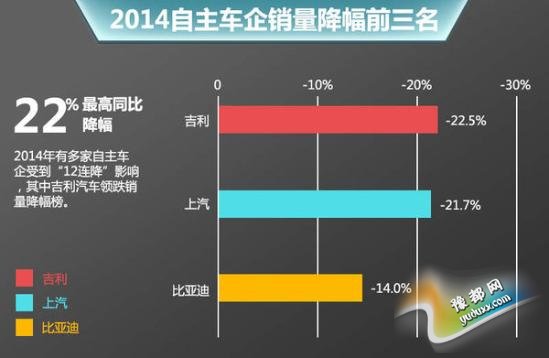 正所谓几家欢喜几家愁,在看过了上述几家销量“飘红”的企业之后,我们再来看看2014年销量下滑最快的都有哪些企业。受制于自主品牌“十二连降”,民营车企受到了更为严重的市场冲击。其中,吉利汽车的销量由2013年时的55万辆大幅下降至42万辆,同比降幅超过20%。与此同时,出现在该份榜单的还有上汽和比亚迪,降幅分别为21.7%和14.0%。