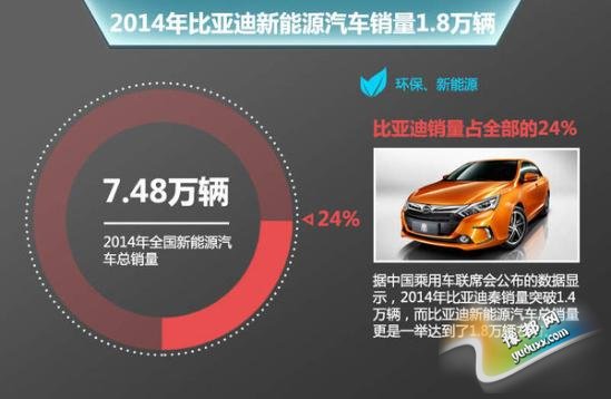 2014年国内新能源汽车销量达到74,763辆,同比实现大幅增长,其中比亚迪销售的新能源车占到近三成的销量份额。据中国乘用车联席会公布的数据显示,仅比亚迪秦一款车型的累计销量便突破了1.47万辆,成为全国新能源乘用车销量冠军。