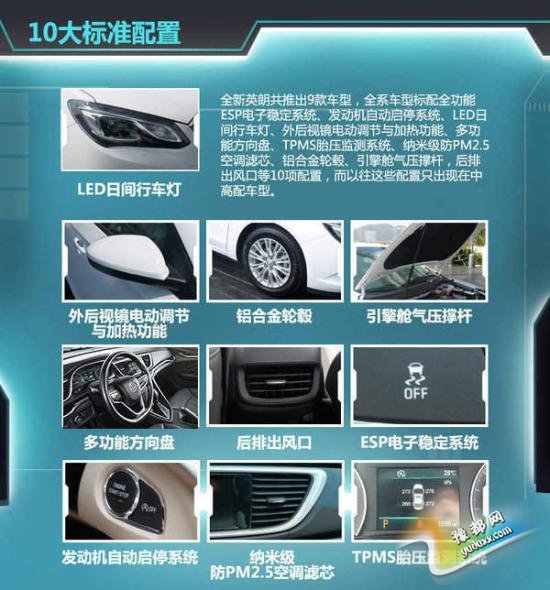 全功能ESP电子稳定系统、发动机自动启停系统、LED日间行车灯、外后视镜电动调节与加热功能、多功能方向盘、TPMS胎压监测系统、纳米级防PM2.5空调滤芯、铝合金轮毂、引擎舱气压撑杆,后排出风口,这些以往只在高端车型出现的实用配置成为英朗的标配,也就是说只要花10.99万元就能拥有。