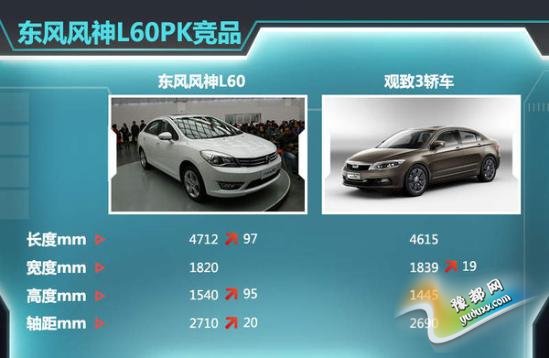 在和同级别竞争对手的较量中,东风风神L60同样展现出了高人一筹的实力。以车身尺寸为例,我们选择了目前自主品牌中综合水平较高的观致3轿车与东风风神这款新车进行对比。通过上面车身长宽高各项数据的逐一对比,东风风神L60大空间的优势得以充分体现。