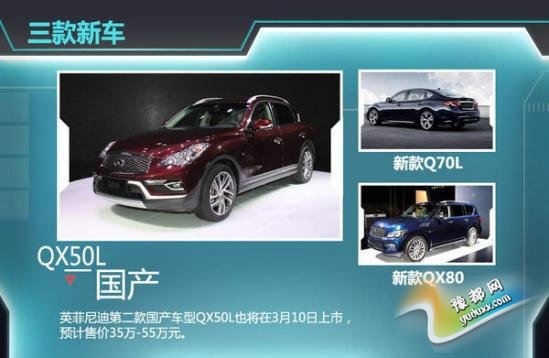 2014年,英菲尼迪一口气在华推出的4款新车,包括首款国产车型Q50L。在新产品的刺激下去年全年英菲尼迪在华销量首次突破3万辆,同比增幅76%。“2015年是国产车型带动销售提升的关键年,更是英菲尼迪中国实现中期规划的关键年。” 英菲尼迪中国总经理戴雷看来透露“第二款国产车型QX50L将在一季度上市,2015年还要陆续引入新款QX80、新款Q70L等车型。”