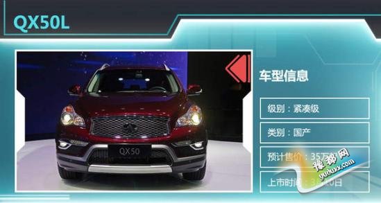 英菲尼迪QX50L相比进口的QX50轴距增加80mm,离地间隙增加15mm达到165mm。外形方面,新车与进口QX50基本一致,只是在个别细节之处做了一些改进。动力方面,QX50L将搭载2.5升自然吸气发动机。该发动机最大功率173kW,最大扭矩253Nm,与发动机匹配的是7速手自一体变速器。据悉,新车有后驱和四驱两个版本可供供消费者选择。未来几年,英菲尼迪将继续加大国产化步伐,到2018年国产车型要占到50%以上。