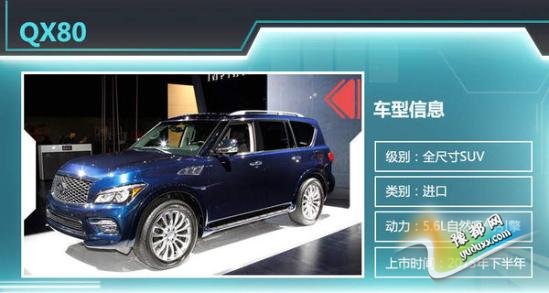 推进国产业务的同时,英菲尼迪进口车阵营同样也将进一步扩大。新款QX80、新款Q70L两款产品今年将陆续引入国内。英菲尼迪新款QX80于2014年纽约车展正式发布,新车在对外观做了小幅调整,动力并无变化。而新款Q70L除外观调整之外,还将提供搭载混动系统的车型,该系统由3.5L V6发动机和电动机组成。随着更多车型的引入,英菲尼迪在中国市场形成了小型至中型SUV全覆盖;轿跑、中型轿车以及新能源车等多细分市场产品布局。