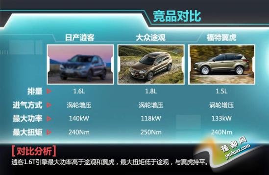日产全新一代逍客搭载1.6T后,面临的首要竞争对手仍是大众途观、福特翼虎等车型,与这两款当前该细分市场中销量表现出色的车型相比,逍客1.6T动力较福特翼虎新增的1.5T EcoBoost发动机更为强劲,即便是在与大众途观1.8T发动机对比也并无较大差距,待新车推出之后,该车将凭借“高输出、低油耗”的优势对这两款车型发起冲击。