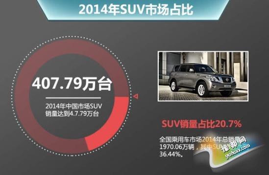 纵观中国2014年乘用车市场发展趋势,整体销量达到1970.06万辆,相比2013年同比增长9.89%,尽管增速有所放缓,但仍是全球范围内增长最快的汽车市场。需要指出的是,SUV车型销量达到407.79万辆,在整个乘用车市场中占比20.7%,每五台乘用车中就有超过1台SUV,同比增长36.44%,这或是日产将引入SUV车型最重要的因素之一。