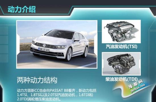 动力方面新CC也会向PASSAT B8看齐,新动力包括1.4TSI、1.8TSI以及2.0TSI汽油发动机,1.6TDI和2.0TDI涡轮增压柴油发动机。