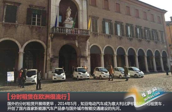 2014年5月,知豆电动汽车成为意大利比萨机场的分时租赁车,开创了国内首家新能源汽车产品参与国外城市智能交通建设的先河。受到意大利环保部门的好评。这是中国电动车一个迟到的好消息。目前,知豆的分时租赁业务,已经在山东沂南启动,各地知豆的经销商也开始尝试。鲍文光说,今年租赁将会占到知豆销量的三分之一。 (作者系原新华社高级记者,网通社社长)