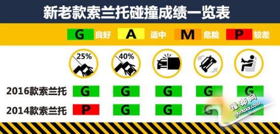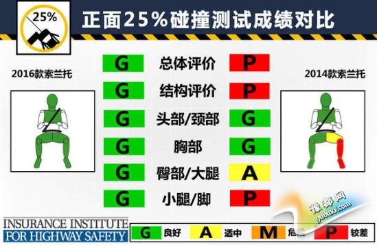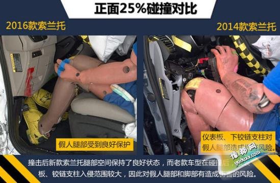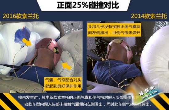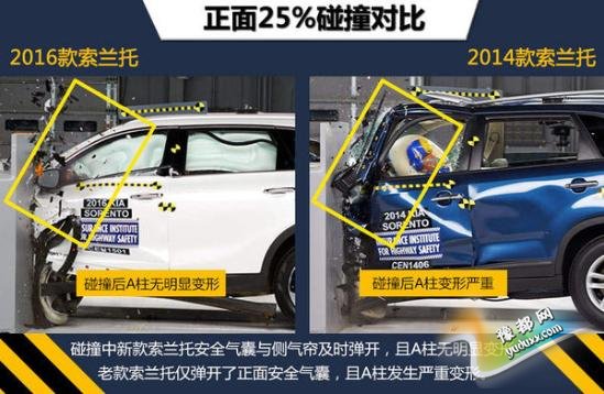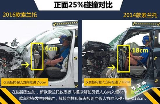 本次参加测试的车型为美版2016款索兰托,对比参照车型为美版2014款索兰托。在最为严苛的正面25%小面积碰撞测试中,老款索兰托总评只拿到最低级别的“P”(较差),碰撞后根据数据读数显示,车内假人的左侧小腿有受到严重伤害的风险,左侧大腿也有受伤风险。而新款索兰托在小面积测试中成绩有所提高,总评以及各小项成绩全部为“G”(良好)。但无论新老款索兰托,在温和的正面40%碰撞、侧面碰撞、顶部碰撞和颈部保护这4大项成绩上都取得了良好成绩,车内乘员身体各个部位在测试中都受到了充分的保护。(注:在美国参加测试车型的最终碰撞成绩仅供国内消费者参考。)