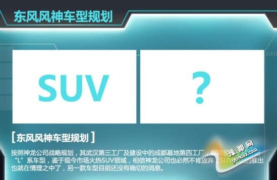 按照神龙公司战略规划,其武汉第三工厂及建设中的成都基地第四工厂,都将投产一款全新“L”系车型,鉴于现今SUV市场持续火热,相信神龙公司不会无动于衷,SUV车型的推出也就在情理之中了,而另一款车型的具体情况,目前还没有确切的消息。