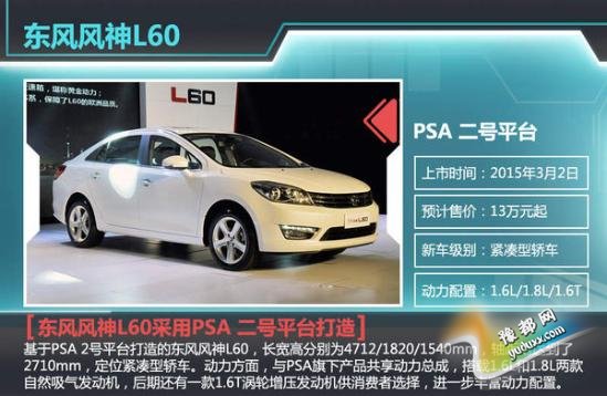基于PSA 2号平台打造的东风风神L60,长宽高分别为4712/1820/1540mm,轴距则达到了2710mm,定位紧凑型轿车。动力方面,东风风神L60与PSA旗下产品共享动力总成,搭载1.6L和1.8L两款自然吸气发动机。其中,1.6L版本最大功率86kW,峰值扭矩150Nm,而1.8L版本的最大功率102kW,峰值扭矩172Nm。后期还有一款1.6T涡轮增压发动机供消费者选择,进一步丰富动力配置。