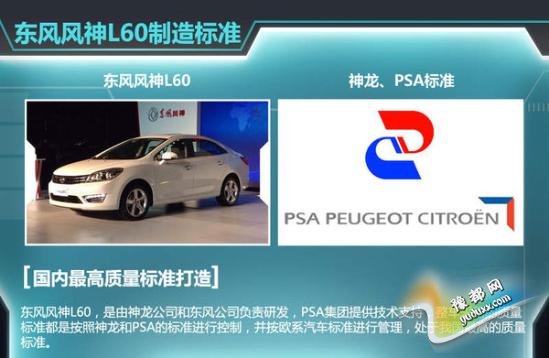 东风风神L60,由神龙公司和东风公司负责研发,PSA集团提供技术支持,整车采用的质量标准都是按照神龙和PSA的标准进行控制,并按欧系汽车标准进行管理,处于我国最高的质量标准,并不是简单地把老旧车型重新进行加工,贴牌制造。对此神龙汽车公司总经理邱现东曾明确表示:东风风神L60有我们标准化的品牌研究并得到充分体现,不是简单地挂上东风风神品牌。