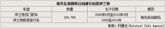 根据NHTSA公布的消息,此次现代在美国召回的车型为旧款伊兰特,包括四门轿车和掀背旅行车。其中前者的生产日期范围是2008年6月1日至2010年4月30日,而掀背旅行车为2009至2010款车型,此次召回共涉及204,768辆车。现代表示,现阶段尚未收到故障引发的相关事故报告,召回将于近期启动。