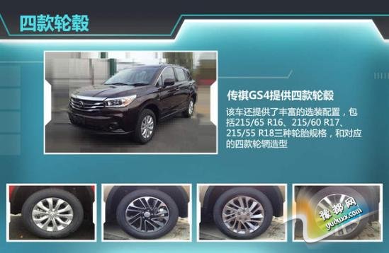 与广汽传祺在北美车展上发布的GS4不同的是,此次曝光的车型只在高配版本上配备了鲨鱼鳍天线。除此之外,氙气大灯、日间行车灯、银色行李架等配置也只会出现在中高配车型上。据了解,广汽传祺GS4还提供了丰富的选装配置,包括215/65 R16、215/60 R17、215/55 R18三种轮胎规格,和对应的四款轮辋造型,以及天窗、前雾灯、大灯清洗器等。