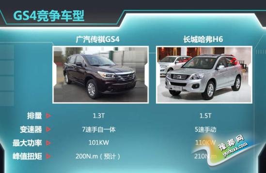 在国内紧凑型SUV市场上,风头最劲的自主品牌产品当属长城哈弗H6,广汽传祺GS4上市后难免要与其正面交锋。对比来看,长城哈弗H6搭载的1.5T引擎在数据上虽然要高于广汽传祺的1.3T。但在雾霾问题跟自然资源问题日益严重的今天,广汽的1.3T发动机在环保性跟燃油经济性上将更加收到人们的亲睐。再加上此前曝出的广汽传祺GS4将搭载的7G-DCT手自一体变速器,相比长城哈弗H6只有2.4车型上配有的4速手自一体变速器,即将在4月份上市的广汽传祺的GS4在竞争力上将更胜一筹。