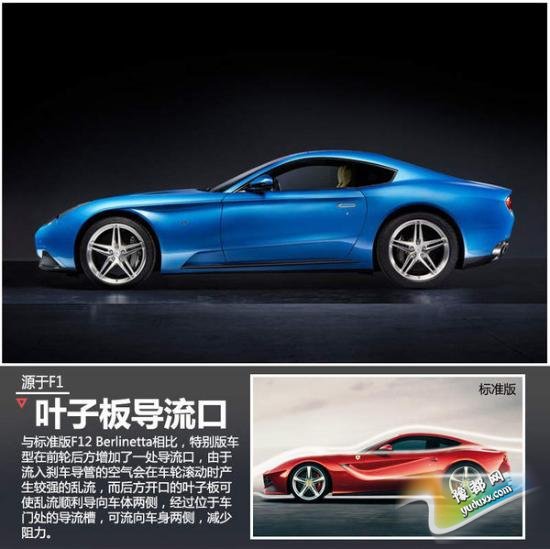 与标准板F12 Berlinetta相比,特别版车型的最大区别在于取消了前叶子板上方的导流槽。由于车身两侧分布着相对较强的负压区,因此在高速巡航时,车侧空气会压在叶子板与门板位置,且由于车体在高速转向时空气密度及流速均会发生改变,因此在极端条件下车体两侧平衡将遭受破坏,不仅增加失控危险,还会对车体造成横向的空气阻力,以至于影响动力发挥及操控。