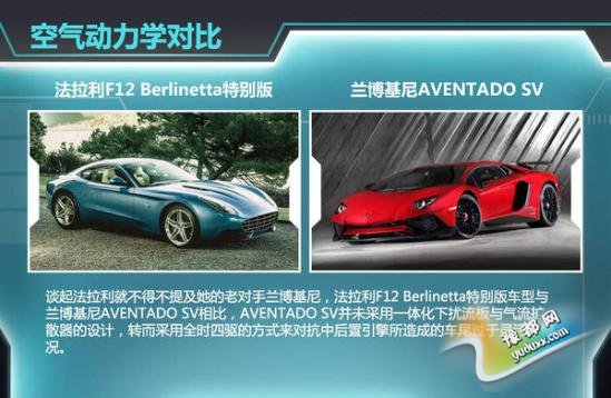 谈起法拉利就不得不提及她的老对手兰博基尼,在这一级别车型的对比中,兰博基尼AVENTADO SV虽然在动力上胜过法拉利F12 Berlinetta特别版车型,但对于超跑相对依赖的空气动力学设计而言,AVENTADO SV却“减配”不少,同样为特别版车型的F12 Berlinetta与AVENTADO SV相比,AVENTADO SV并未采用一体化下扰流板与气流扩散器的设计,转而采用全时四驱的方式来对抗中后置引擎所造成的车尾过于灵活的情况。