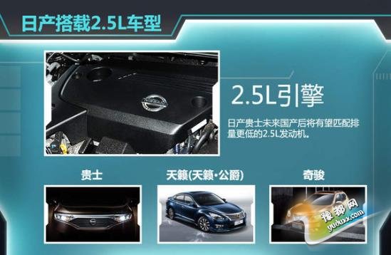 需要指出的是,贵士目前搭载的是3.5L V6发动机,最大输出功率为204kW,峰值扭矩为326Nm,官方并未公布该车油耗数据,但国内今年开始实施的排放标准要求更高,因此该车国产之后将有望搭载排量更小的2.5L发动机,目前该款发动机已在天籁(天籁公爵)和奇骏上成功搭载。