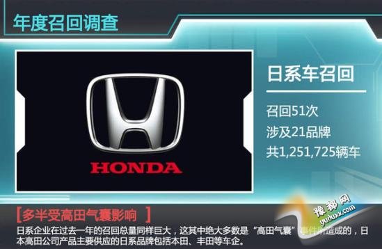 在过去的一年缺陷汽车的召回总量相比2013年同期明显增加。其中,德系和日韩系共有32只品牌宣布召回车辆,总量超过291万辆。其中德系11只品牌宣布了35次召回,涉及166万台/次以上的产品;日韩系21只品牌宣布了51次召回,涉及125万台/次以上的产品。
