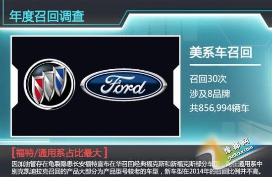 2014年9月,因加油管存在龟裂隐患长安福特宣布在华召回经典福克斯和新福克斯部分车型,总计设计191,770辆车受到影响。而在通用系中别克凯迪拉克召回的产品大部分为产品型号较老的车型,新车型在2014年的召回比例并不高