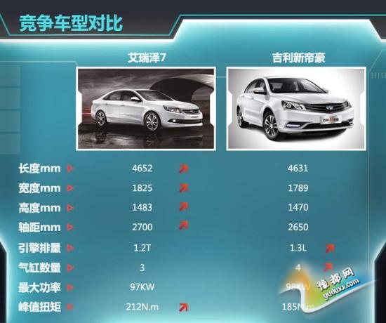 新增发动机后,艾瑞泽7将与同级别内销量领先的吉利新帝豪,吉利新帝豪同样是,吉利汽车经过车型结构调整,回归一个品牌战略的成果,这与奇瑞汽车的发展方向颇有些殊途同归的味道。尺寸方面,艾瑞泽7长宽高分别为4652/1825/1483mm,轴距达到了2700mm,与竞争对手相比,优势明显。发动机方面,虽然在排量上与吉利新帝豪相比并不占优势,但在动力输出上并不落下风,最大功率仅比对手低1KW,值得一提的是,在峰值扭矩方面奇瑞1.2T发动机相比对手优势明显,多出27N.m。