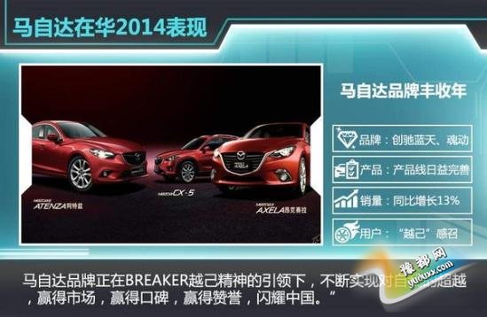 随着近期相关数据的公布,不得不说,2014年是马自达在华的“丰收年”。数据显示,2014年全年,马自达品牌车型在华累计销售211,013辆,同比增长13.0%,值得注意的是,从马自达在华全年的销售结构来看,搭载“创驰蓝天”技术的3款车型CX-5、Axela昂克赛拉、Atenza阿特兹占据销量的半壁江山,成为马自达品牌在华发展的一道亮丽风景线。
