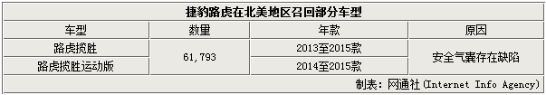 根据NHTSA公布的消息,此次在北美地区被召回的车型为2013至2015款路虎揽胜和2014至2015款路虎揽胜运动款,共涉及61,793辆。捷豹路虎官方表示,目前尚未收到因此类隐患而引发的事故报告,召回将于4月开始。