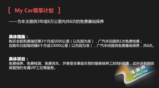 具体措施是:消费者在购买全新凯美瑞后第3个月或5000公里(以先到为准),广汽丰田将为消费者提供1次免费检查;自购车日起每间隔6个月或10000公里(以先到为准),广汽丰田将为消费者提供免费基础保养,共计6次。主要包括免费保养、免费检测、免费洗车、并享受非事故车预约维修保养工时8折优惠,此外还有提供保留预约专属VIP工位等服务。