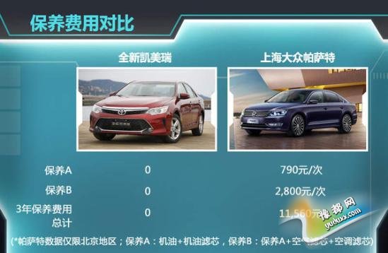“3年6万公里免保”这一政策在B级车市场中,也有着标杆性的地位。以与全新凯美瑞同级的上海大众帕萨特为例,该车A保为790元/次,B保为2800元/次。根据4S售后人员介绍,通常新车在行驶5000公里时就应该进行首次保养,前一万公里两次小保养和每两万公里一次大保养来算,帕萨特3年的保养费用将近11560元。相比3年免费保养的凯美瑞来说,着实省了一笔豪华自驾游的费用。