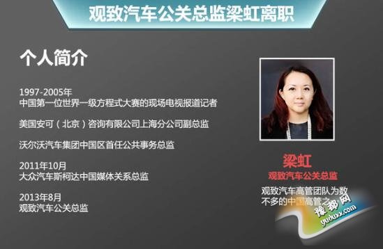 《观致汽车人事调整 公关总监梁虹离职-图》由河南新闻网-豫都网提供,转载请注明出处:http://auto.yuduxx.com/changjia/151956.html,谢谢合作!