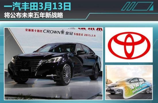 作为丰田在华的主力军,2014年一汽丰田全年完成销售58.6万台,占丰田在华累计销量的56.9%。2月9日,全新皇冠正式下线,同时也开启了一汽丰田2015年征程。近日,网通社从一汽丰田官方获悉:一汽丰田将于3月13日公布未来新战略。根据此前发布的信息来看,将涉及未来中期目标及发布新车型的具体情况。