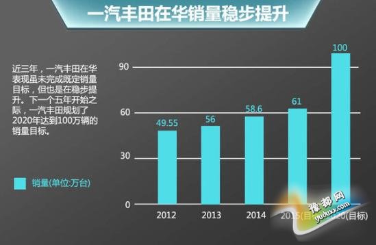 近三年,一汽丰田在华表现虽未完成既定销量目标,但也是在稳步提升。2012年,以49.55万辆的成绩收官;2013年,一汽丰田最终完成了56万辆。去年则是实现了销售58.61万辆。从2015年开始,一汽丰田将步入新的开始,今年销量目标定在了61万台。同时下一个五年开始之际,一汽丰田规划了2020年达到100万辆的销量目标。