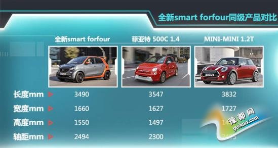 全新smart forfour的综合考虑更符合国内消费者购车需求的,车型小巧灵活、配置丰富,四门四座的设计载人载物更为便捷。这款车长宽高分别为3490/1660/1550mm,轴距达到了2494mm,比新一代的smart fortwo 1873的轴距要大出不少。同级产品中,菲亚特500 1.4L车型轴距为2300mm、MINI-MINI 1.2T车型轴距为2495mm,这款smart forfour并不落下风。新车0.9T发动机135Nm的扭矩输出,不论是动力表现还是消费税的比例上都更有优势。(网通社 3月1日 北京报道)
