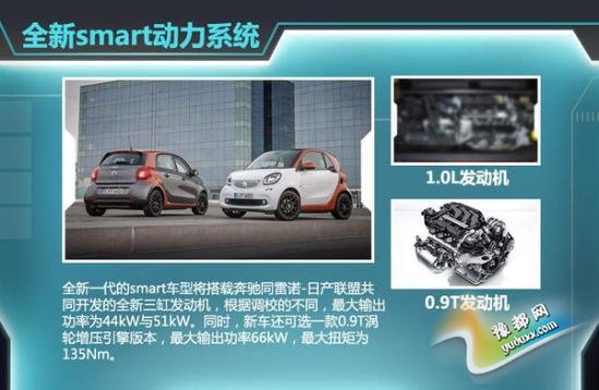 全新一代的smart车型将搭载奔驰同雷诺-日产联盟共同开发的全新三缸发动机,根据调校的不同,最大输出功率为44kW与51kW。同时,新车还可选一款0.9T涡轮增压引擎版本,最大输出功率66kW,最大扭矩为135Nm。除此之外,未来还将推出Brabus版本担当旗舰车型及一款纯电动版本的车型。传动方面,将匹配5速手动或6速双离合变速箱,相比现款车型的序列式变速箱,舒适性、平顺性、经济性及动力表现均有提升。