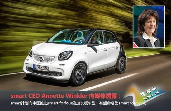 在去年巴黎车展上,smart携两款新车smart fortwo与forfour亮相。其中,全新smart forfour的轴距为2494mm,虽然新车增加了后排座椅,但是后排腿部空间仍旧有限。因此为了更照顾对后排空间有需求的中国市场,smart决定专门为中国市场推出smart forfour的加长版车型。最近,smart CEO向媒体透露:“smart计划向中国推出smart forfour的加长版车型,有望命名为smart formore。”