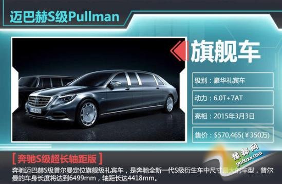 按照奔驰的产品投放节奏,迈巴赫S级普尔曼在日内瓦车展进行全球首发之后,后续还将亮相上海车展,随后于2016年交付第一批用户,同年在引入中国市场销售。奔驰迈巴赫S级普尔曼定位旗舰级礼宾车,是奔驰加长S级衍生车中尺寸最大的车型,普尔曼的车身长度将达到6499mm,轴距长达4418mm。
