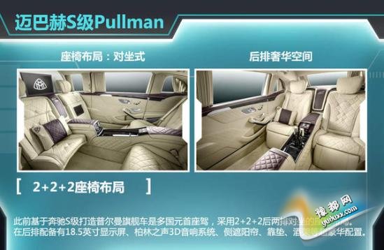 据了解,此前基于奔驰S级打造普尔曼旗舰车便是全世界多国元首座驾,拥有很高的知名度,采用2+2+2后两排对坐的座椅布局方式。即将亮相的全新迈巴赫S级普尔曼也将沿用这一设计,在车内配置方面,普尔曼还在后排配备有18.5英寸显示屏、柏林之声3D音响系统、侧遮阳帘、靠垫、酒架等超豪华配置。海外市场售价高达570,465美元(约合350万元人民币),引入国内后的售价将在500万元以上。