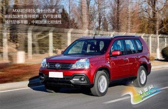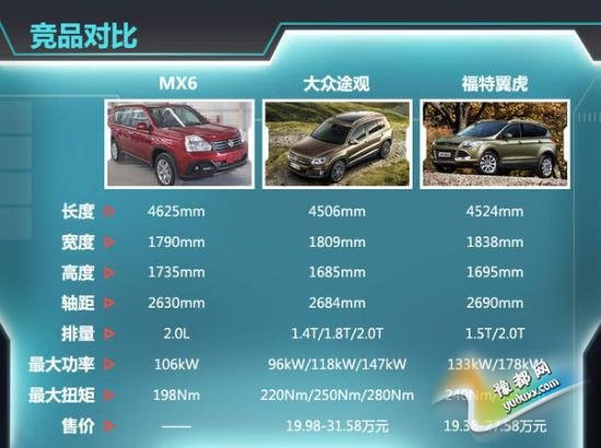 在车身尺寸方面,MX6长宽高分别为4625mm、1790mm、1735mm,轴距为2630mm,尽管与时下同级别中最为热门的大众途观以及福特翼虎等车型相比有一定距离,但该车定位兼顾家用与越野风格。与此同时,加上价格等因素,该车在同级别中也拥有较高的性价比,届时,MX6将助推郑州日产取得更大的市场占比。